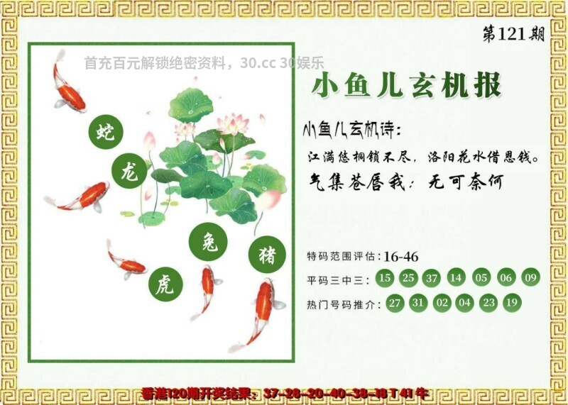 | 120期 | 波色:蓝红 | 家野:家禽+虎 | 单双:双 | 尾:0234569 |